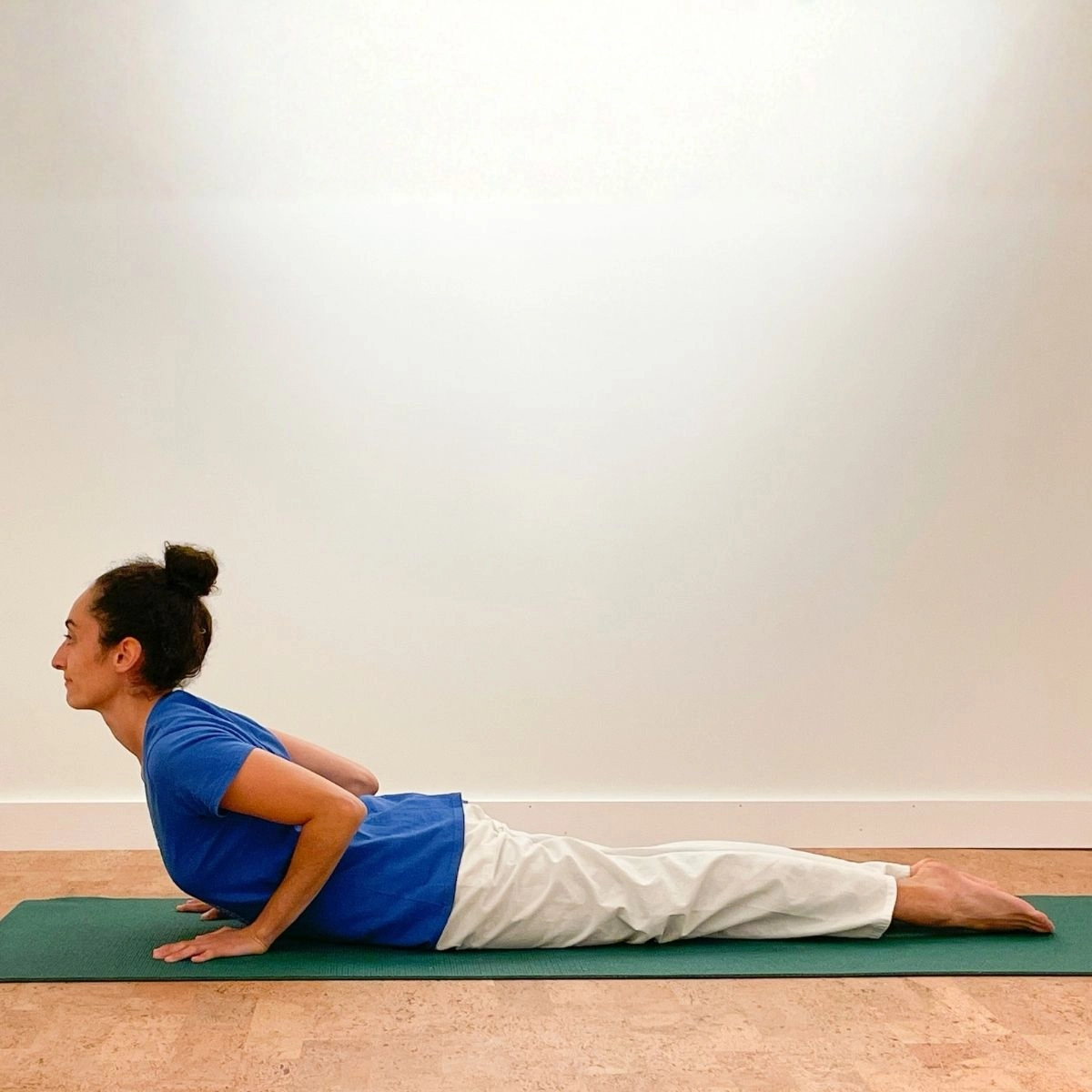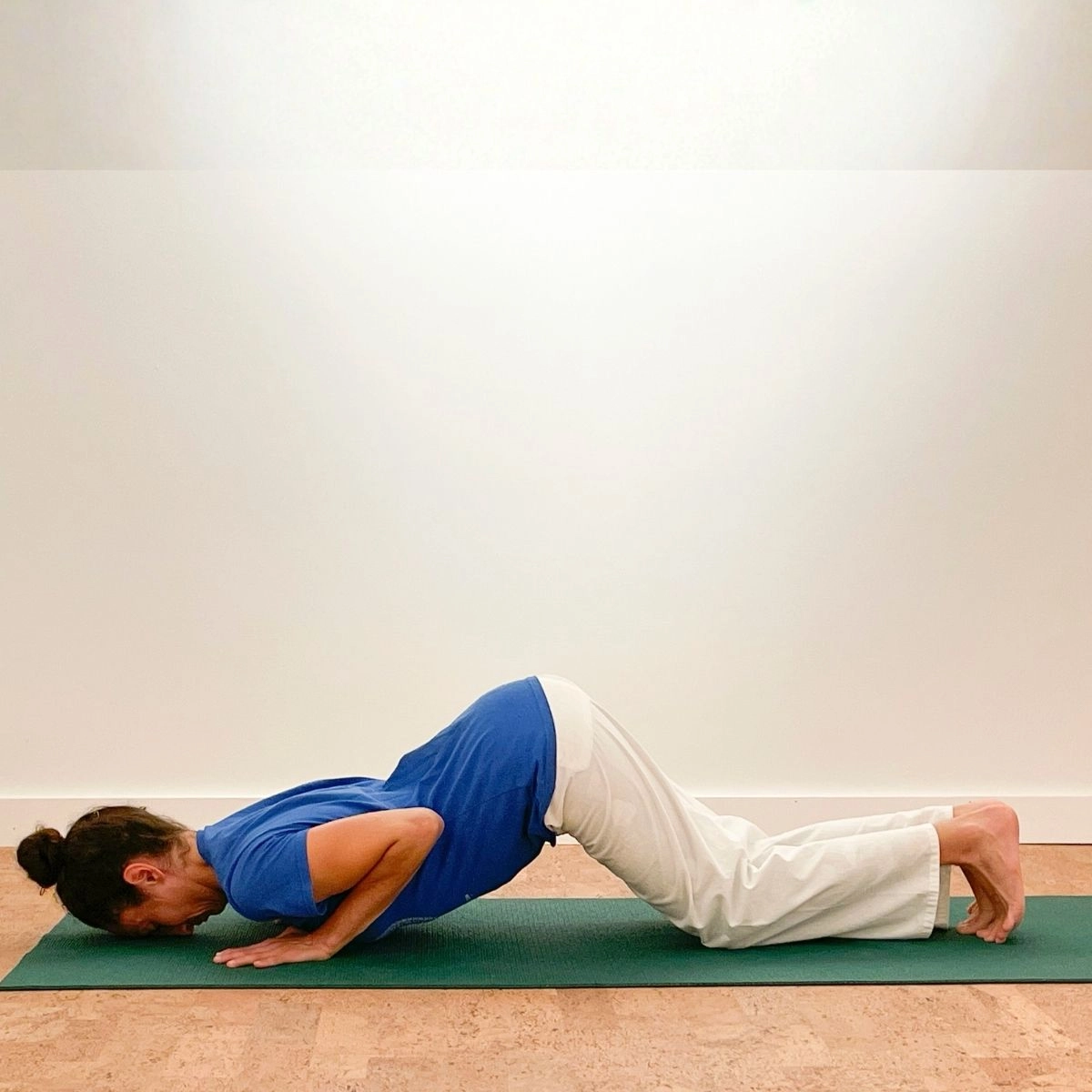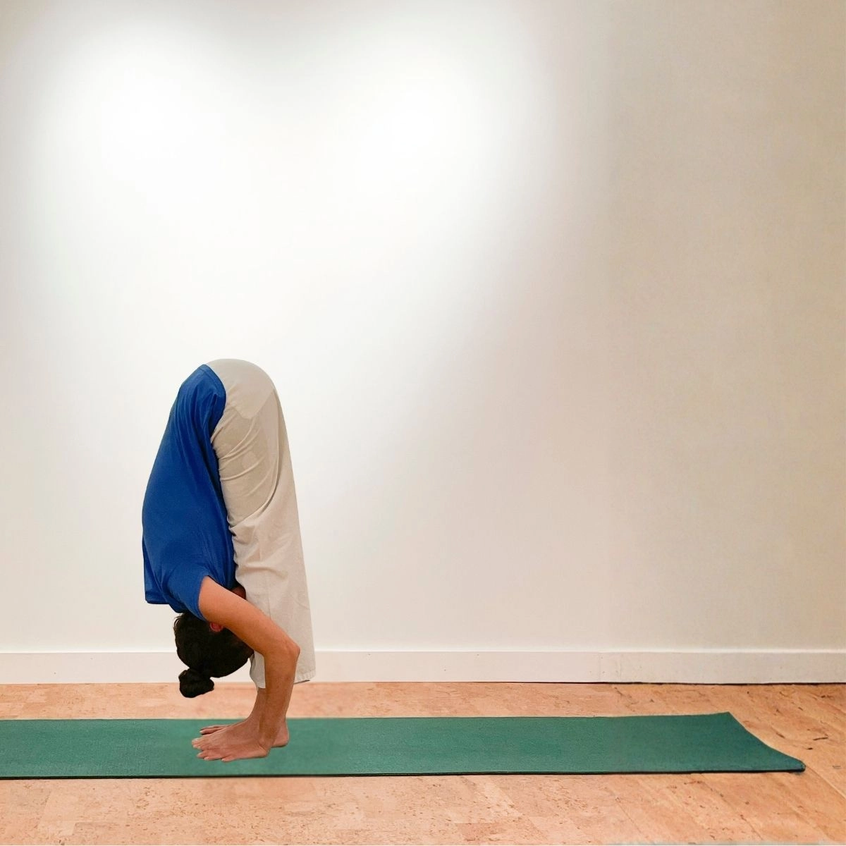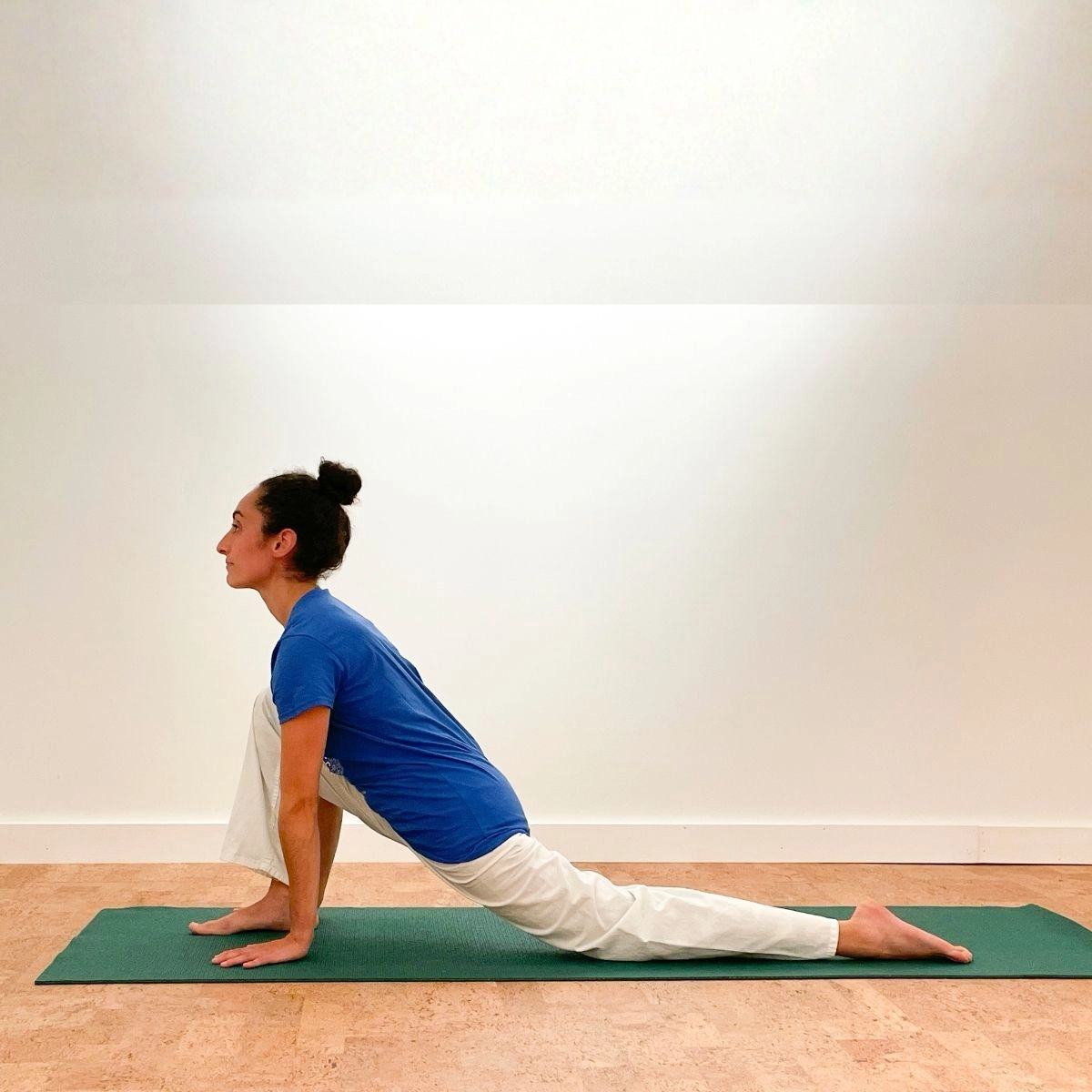 One round of Sun Salutation consists of two sequences, the first leading with the right foot in positions 4 and 9, the second leading with the left. Keep your hands in one place from positions 3 to 10 and try to coordinate your movements with your breathing. Start by practicing four rounds and gradually build up to twelve rounds