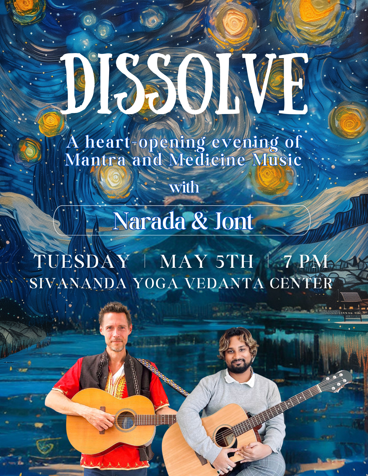 Rooted in meditation, nourished by travel, and shaped by lives devoted to song, Dissolve offers an evening of healing atmosphere and warmth. Whether you are new to mantra music or familiar with kirtan, we welcome you.